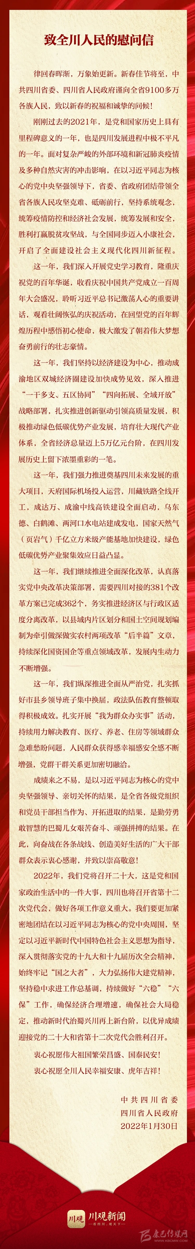 新春佳節(jié)將至,中共四川省委、四川省人民政府發(fā)出慰問信,向全省9100多萬各族人民,致以新春的祝福和誠摯的問候!衷心祝愿偉大祖國繁榮昌盛、國泰民安!衷心祝愿全川人民幸福安康、虎年吉祥!