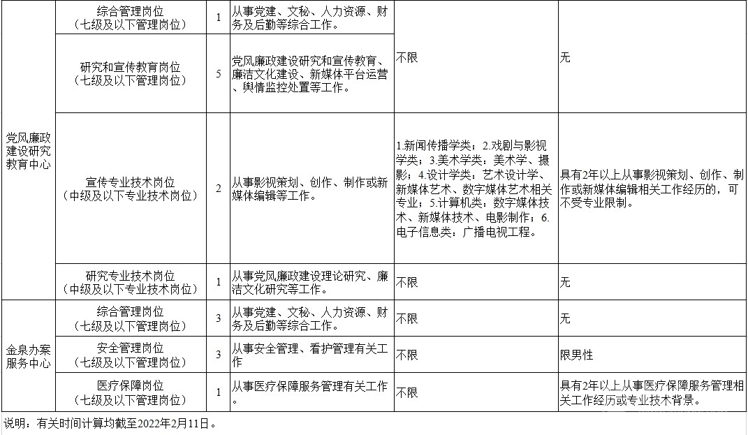 考調(diào)名額 考調(diào)事業(yè)人員25名。其中,信息技術(shù)中心管理崗位9名,黨風廉政建設(shè)研究教育中心管理崗位6名、專業(yè)技術(shù)崗位3名,金泉辦案服務(wù)中心管理崗位7名。 考調(diào)對象及條件 考調(diào)對象 全省范圍內(nèi)行政單位或參公事業(yè)單位一級主任科員(含)以下職級及相當職務(wù)層次人員;縣級及以上公益一類或全額撥款事業(yè)單位管理崗位七級及以下職員、專業(yè)技術(shù)崗位中級及以下工作人員。 考調(diào)條件 具有良好的政治素質(zhì)、專業(yè)素養(yǎng),品行端正,實績突出,群眾公認。 中共黨員。 全日制大學本科及以上學歷,并取得相應學士及以上學位。 年齡35周歲以下(1986年2月11日及以后出生)。 歷年年度考核均為合格(稱職)及以上。 身體心理健康,具有正常履行職責的身體條件和心理素質(zhì)。 符合報考崗位規(guī)定的資格條件,詳見《中共四川省紀委四川省監(jiān)委2022年公開考調(diào)事業(yè)人員崗位情況表》(附后)。 符合法律、法規(guī)規(guī)定的其他條件。 有關(guān)時間計算均截至2022年2月11日。 具有下列情形之一的,不得報考: 被依法列為失信聯(lián)合懲戒對象的。 涉嫌違紀違法正在接受有關(guān)專門機關(guān)審查尚未作出結(jié)論的。 受過黨紀政務(wù)處分或司法機關(guān)刑事處罰的。 受到誡勉、組織處理等影響期未滿或期滿影響使用的。 按照有關(guān)規(guī)定,到定向單位工作未滿服務(wù)年限或有其他限制性規(guī)定的。 尚在試用期的。 按照相關(guān)規(guī)定應當回避的。 法律、法規(guī)規(guī)定的其他情形。 報名及打印準考證 2022年2月22日上午8:00至2月26日下午18:00,報名人員登錄四川省人力資源和社會保障廳官網(wǎng)(http://rst.sc.gov.cn/)首頁“人事考試”專欄進行網(wǎng)上報名,每人限報一個崗位。 對報名人員進行網(wǎng)上資格初審,通過資格初審者可于2022年3月1日上午8:00至3月2日下午18:00,登陸報名系統(tǒng)打印筆試準考證。 考試 考試分筆試和面試。其中,信息技術(shù)崗位A、信息技術(shù)崗位B、宣傳專業(yè)技術(shù)崗位需加試專業(yè)測試。 根據(jù)筆試情況,擇優(yōu)確定進入面試的人選,并適時開展資格復審和心理素質(zhì)測試。資格復審、心理素質(zhì)測試、面試時間和地點另行電話通知。 考察、體檢及試用 考察 根據(jù)考試情況,擇優(yōu)差額確定進入考察對象,深入考察了解人選政治表現(xiàn)、工作能力、廉潔自律和性格特點等。 體檢 根據(jù)考察情況和職位要求,擇優(yōu)等額確定進入體檢人選,參照《公務(wù)員錄用體檢通用標準(試行)》進行體檢。 頂崗試用 綜合人選考試成績、考察情況,根據(jù)工作需要和人崗相適原則,擇優(yōu)確定頂崗試用人選。 調(diào)入 試用期滿后,根據(jù)考調(diào)名額和試用期間表現(xiàn),研究確定擬調(diào)人員,經(jīng)公示后按規(guī)定程序辦理調(diào)入手續(xù)。 注意事項 報考者應保證提供真實、準確、全面的個人信息和資料,如有弄虛作假的行為,將按有關(guān)規(guī)定嚴肅處理。 資格審查貫穿考調(diào)全過程,任一環(huán)節(jié)發(fā)現(xiàn)有不符合考調(diào)條件的,取消考調(diào)資格。 報名時請按要求填寫本人手機號碼,并保持通訊暢通。未入圍下一環(huán)節(jié)人員,不再另行通知。 進入資格復審者,需由有干部管理權(quán)限的主管部門出具同意考調(diào)的書面意見并加蓋公章。 嚴明考調(diào)紀律,報名者不得托人說情、打招呼,一經(jīng)發(fā)現(xiàn)即取消資格。 遵守疫情防控相關(guān)規(guī)定,服從工作人員安排。 同時,四川省紀委監(jiān)委還提供相關(guān)咨詢電話:028—62555435;62555354。 (點擊查看大圖)