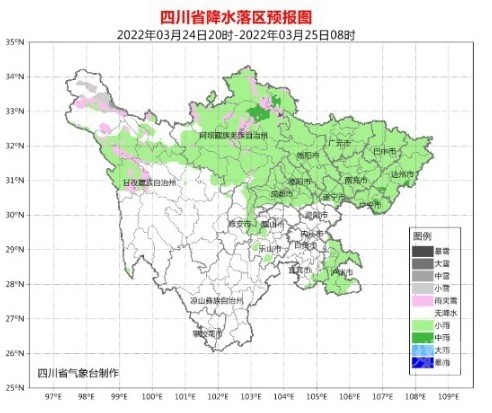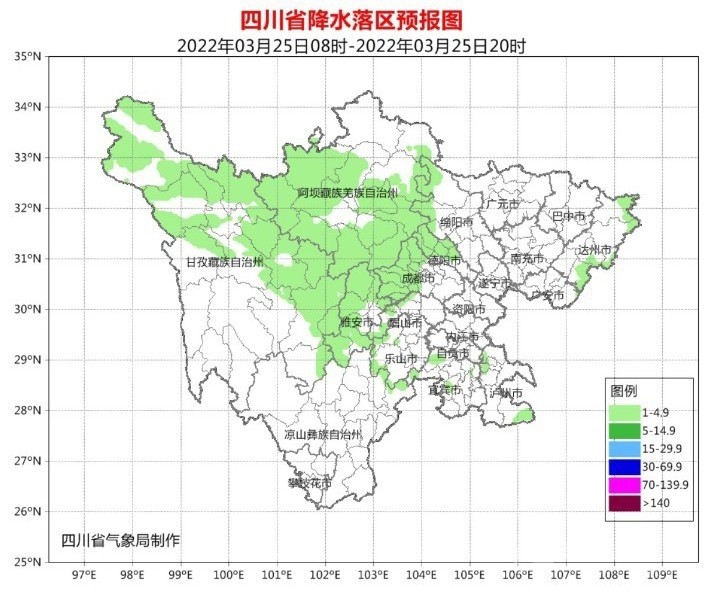 明天(3月25日)白天,盆地各市陰天轉多云,西部沿山有分散小雨;阿壩州大部、甘孜州北部東部陰天間多云有小雨(雪),甘孜州其余地方和攀西地區(qū)多云間晴。