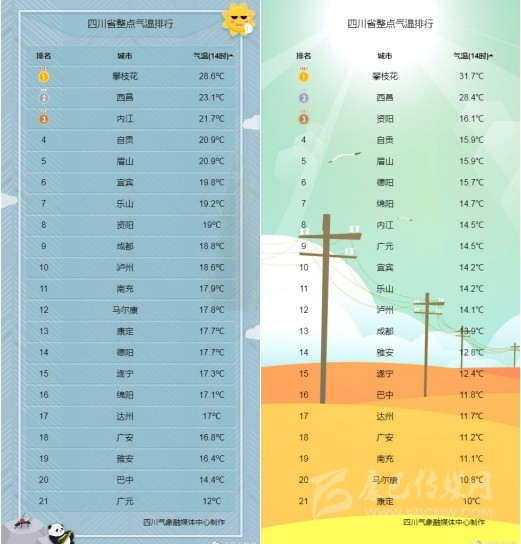3月23日(左圖)與3月22日(右圖)四川各城市實況氣溫對比。