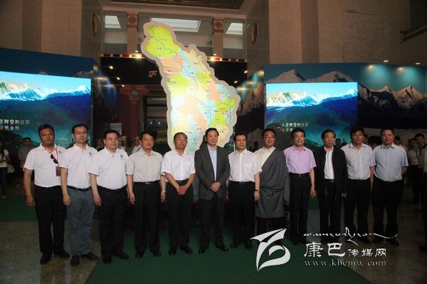 在一幅巨大的貢嘎云海風(fēng)光圖片前,劉奇葆興致勃勃地與陪同視察的領(lǐng)導(dǎo)合影留念。
