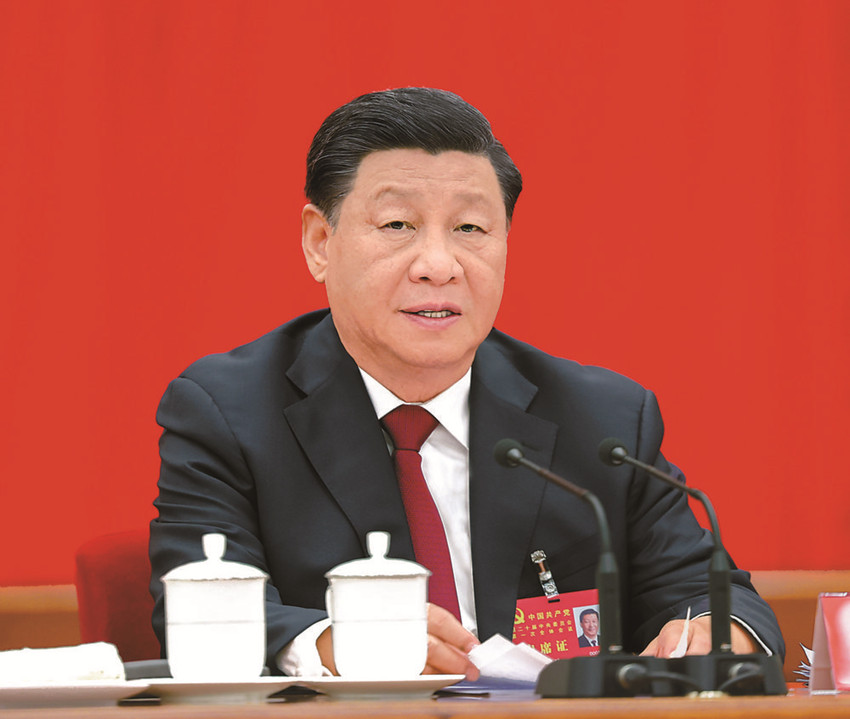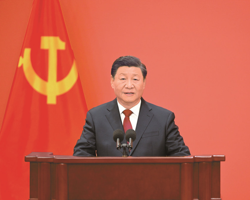 10月23日,剛剛在中國共產(chǎn)黨第二十屆中央委員會第一次全體會議上當(dāng)選的中共中央總書記習(xí)近平和中共中央政治局常委李強、趙樂際、王滬寧、蔡奇、丁薛祥、李希在北京人民大會堂同采訪中共二十大的中外記者親切見面。這是習(xí)近平發(fā)表重要講話。 新華社記者 李學(xué)仁 攝