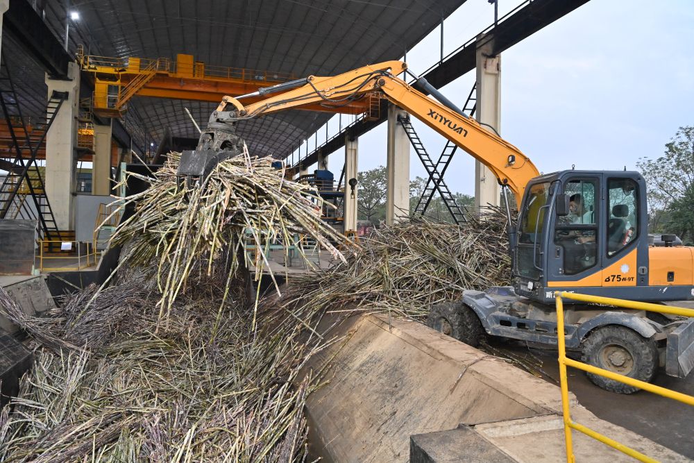 12月14日,在廣西來(lái)賓東糖鳳凰有限公司,員工操作機(jī)械將甘蔗投入傳送帶,準(zhǔn)備送往壓榨車間。