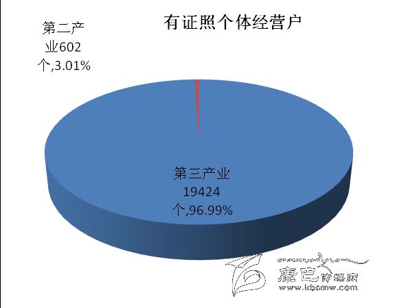 在有證照個體經(jīng)營戶中,第二產(chǎn)業(yè)占3.01 %;第三產(chǎn)業(yè)占96.99 %。有證照個體經(jīng)營戶從業(yè)人員中,第二產(chǎn)業(yè)占3.82 %,第三產(chǎn)業(yè)占96.18 %。