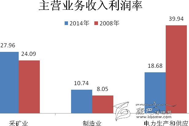 2013年,規(guī)模以上工業(yè)企業(yè)法人單位總資產(chǎn)貢獻(xiàn)率為8.46%,比2008年下降4.56個(gè)百分點(diǎn)。主營(yíng)業(yè)務(wù)收入利潤(rùn)率為18.83%,比2008年下降11.12個(gè)百分點(diǎn)。其中,采礦業(yè)為27.96%,比2008年上升3.87個(gè)百分點(diǎn);制造業(yè)為10.74%,比2008年上升2.69個(gè)百分點(diǎn);電力、熱力、燃?xì)饧八a(chǎn)和供應(yīng)業(yè)為18.68%,比2008年下降21.26 個(gè)百分點(diǎn)(詳見(jiàn)表2-4)。