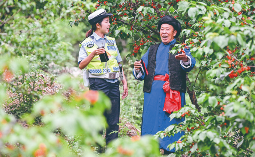 “所有開車駕駛員,自我告誡重三件。發(fā)動車輛開車前,重要部位查一遍。發(fā)動車輛開車前,排除隱患保安全。所有開車駕駛員,發(fā)動車輛開車前,系安全帶要規(guī)范。安全行駛最重要,平平安安回家園?!?024年瀘定紅櫻桃采摘體驗季推薦會前夕,在果實累累的杵坭村櫻桃樹下,素有“微笑交警”之譽的劉格蘆同省級非物質文化遺產——瀘定山歌傳承人吳全清老人,冒著細雨一道錄制《開車自我告誡重三件》快板說唱視頻,在“平安甘孜”公眾號上傳播。