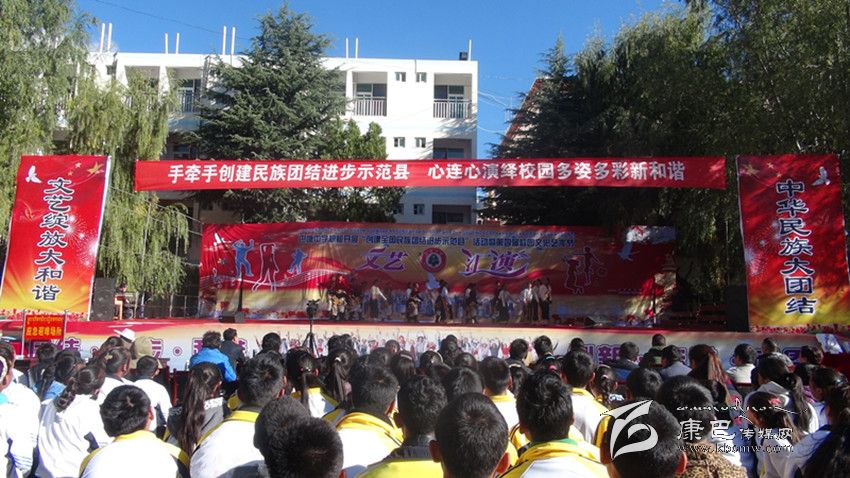 “手牽手創(chuàng)建民族團結進步示范縣·心連心演繹校園多姿多彩新和諧”被確定為本次活動的主題。輕快的音樂,靈動的舞步,具有濃郁藏民族特色的《炫舞鍋莊》拉開文藝表演的帷幕。表演者穿戴藏族服飾載歌載舞,盡情表演,瞬時將氣氛推向了高潮。文藝表演以學生的班級和教師的教研組為單位,將各自班級或教研特色融入到表演中,特別是一曲《做不到》,兩名男女中學生將學生時期的叛逆思想和對未來美好生活的向往展現得淋漓盡致。大合唱《我相信》,盡現了全班同學的團隊精神。同學們個個精神抖擻、氣勢如虹,唱出了對未來的無限希翼。表演持續(xù)2個多小時,教師和學生們將他們精心編排、傾情演繹的一個個精彩節(jié)目呈現給現場觀眾。