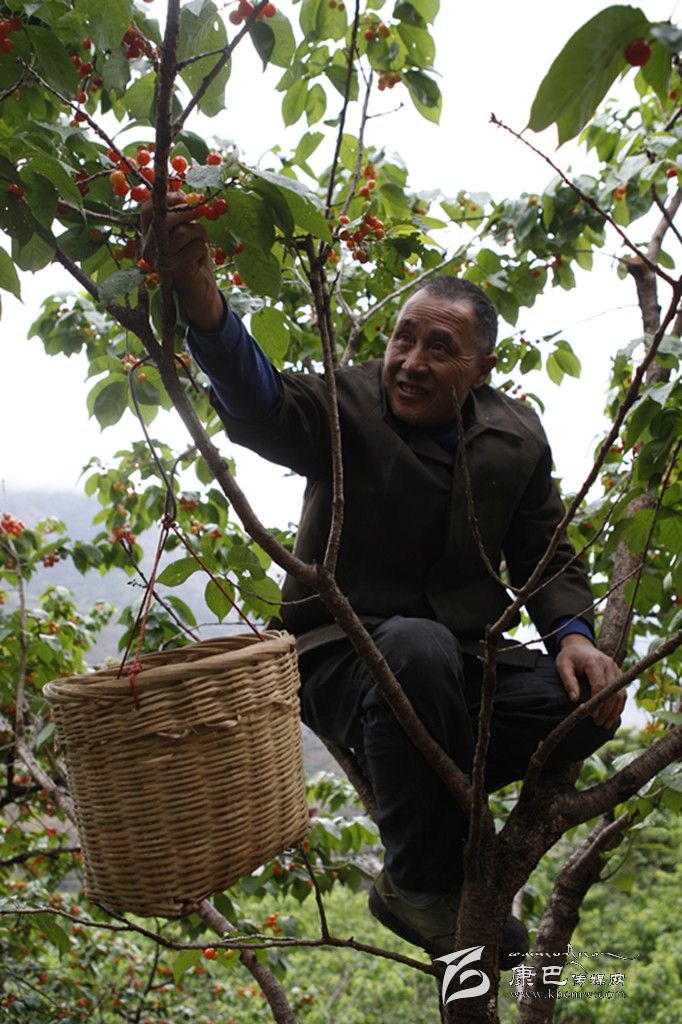 杵坭紅櫻桃產(chǎn)業(yè)的發(fā)展給當(dāng)?shù)卮迕駧砹司薮蟮膶?shí)惠。杵坭鄉(xiāng)杵坭村羊兒槽組村民田忠華家每年僅賣櫻桃就能收入近70000元。圖為田忠華正在自家櫻桃園采摘櫻桃。