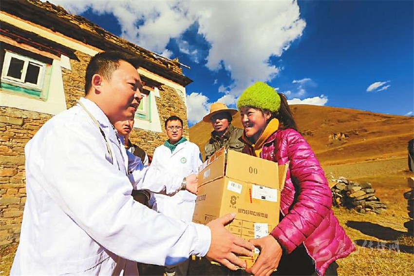 右圖:2016年11月2日,遂寧市中心醫(yī)院派駐康定市人民醫(yī)院的城鄉(xiāng)醫(yī)療對(duì)口支援醫(yī)療隊(duì),深入新都橋鎮(zhèn)呷巴鄉(xiāng)自弄村特困戶彭措拉姆(右一)家義診,并向她捐贈(zèng)了衣物。 (資料圖片)
