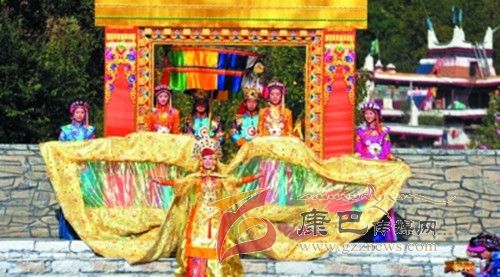 在催人奮進(jìn)的戰(zhàn)鼓聲中,一群身披甲胄的士兵拿著長劍,背著巨弓走到臺前,在鏗鏘的戰(zhàn)鼓聲中,戰(zhàn)士們做著各種競技動(dòng)作,模仿武士們互相攻擊的樣子,那矯健的身影展示了遠(yuǎn)古時(shí)代嘉絨藏族先民們?yōu)榱松媾c自然努力抗?fàn)幍膱鼍?。過了一會(huì)兒音樂一轉(zhuǎn),戰(zhàn)鼓聲漸漸減弱,在鳥雀的陣陣啾啾聲中,一座木門慢慢的開啟,一位身披長袍、頭戴鳳冠的女王在眾多美女的簇?fù)硐?,緩緩走下臺階步入舞臺中央,此時(shí),一位手捧托盤的老者來到女王面前單膝下跪,將托盤高舉過頂,并邀請女王品嘗佳肴,女王將中指在酒中蘸了蘸,并曲起中指向四周輕輕彈去,寓意愿將杯中美酒與四方百姓同飲。在女王面前還放置著一個(gè)凈水桶,桶中盛滿了清澈的甘泉,桶上橫放著一枝柏樹枝,女王伸出纖纖玉手,拿著柏樹枝在水中蘸了蘸,面向墨爾多神山撒去,寓意向神山祈福。這是此次《美人谷·丹巴》節(jié)目展演中的序曲部分,有著強(qiáng)烈的東女神韻,將遠(yuǎn)古時(shí)代東女國女王遺風(fēng)展演的淋漓盡致。