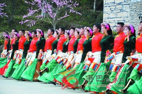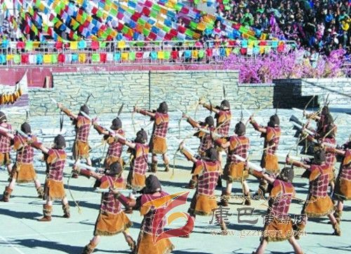 10月26日,在甲居藏寨,處處洋溢著豐收和歡樂的氣氛,人們扶老攜幼,身著節(jié)日的盛裝走到一起,來共同慶祝丹巴嘉絨風(fēng)情節(jié)的順利召開。在一塊空地中,搭建了臨時(shí)的舞臺,看臺上,幾座古碉模型傲然挺立,在不遠(yuǎn)處,一座古碉矗立在一座小山包上,與古碉模型遙相呼應(yīng)、相映成趣。上午9時(shí)40分,當(dāng)節(jié)目主持人宣布嘉絨風(fēng)情節(jié)正式開始時(shí),一束束搖曳的煙花向空中飛去,在空中炸響后,散發(fā)出五顏六色的煙霧,其中有的還幻化成幾多小小的降落傘,就像多多盛開的鮮花在空中綻放。演出現(xiàn)場前的大地和遠(yuǎn)處的小山坡上到處都站滿了熱情的觀眾,合著禮花的爆裂時(shí)的響聲,將手中的小紅旗展開,高舉過頭頂,有節(jié)奏的左右搖動(dòng),霎時(shí)間,整個(gè)現(xiàn)場成為了紅色的海洋。