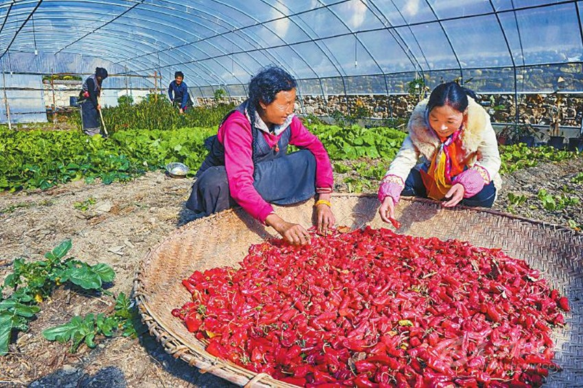在對(duì)口幫扶下,然央村種植的大棚辣椒豐收了。