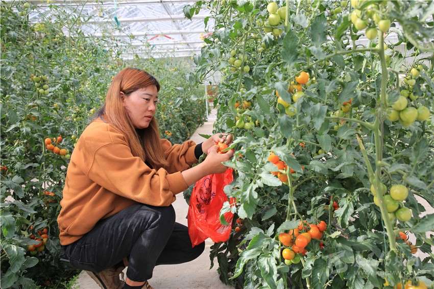 記者來到產(chǎn)業(yè)園的智能溫室大棚,只見里面各種紅的黃的綠的、大的小的番茄,掛滿藤蔓?!盎匾苑N植綠色無公害農(nóng)產(chǎn)品為主,這是我們今年開始試種的小番茄,有十來個品種,你別看它還是綠色的,其實已經(jīng)成熟了?!庇浾呓舆^孟凡強摘下的幾個小番茄,一口咬下,香甜多汁且沁人心脾。孟凡強介紹,這是他們與北京神州綠鵬農(nóng)業(yè)科技有限公司合作,精選引進中國航天工程育種的優(yōu)質(zhì)品種。除了番茄,溫室內(nèi)還種有秋葵、辣椒、小葫蘆、僧帽瓜等蔬菜,處處綠意盎然。