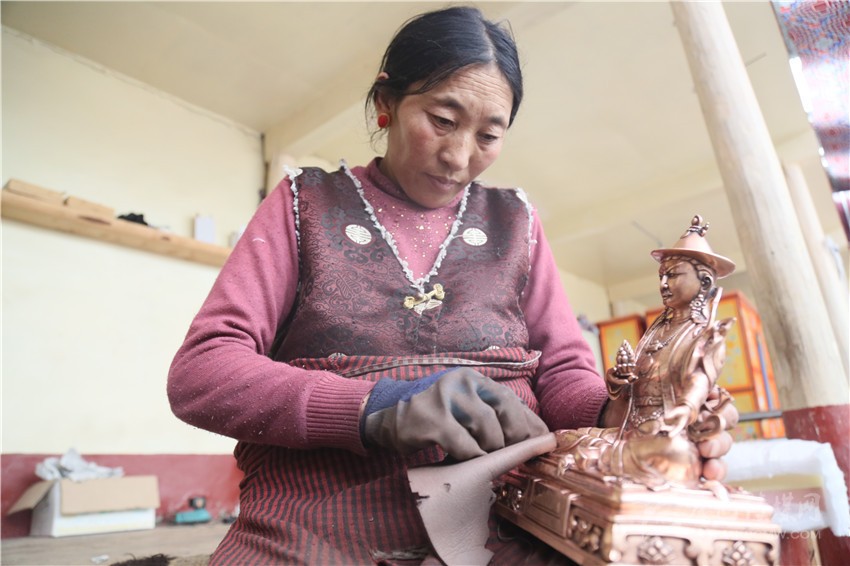 一雙粗糙而靈巧的手正一絲不茍地對銅像進(jìn)行最后的打磨。這是一雙執(zhí)著于銅鑄工藝43年的手。尼瑪從7歲開始學(xué)習(xí)銅鑄手藝,是該項工藝的州級非物質(zhì)文化傳承人。