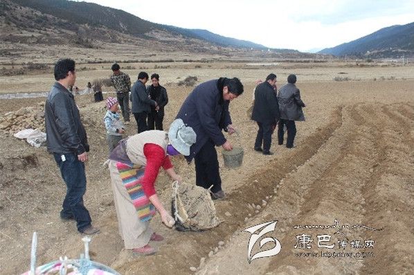 在格中村的田間地頭,到處是一片忙碌的春播景象。雷建平走進(jìn)斯朗卓瑪?shù)奶镩g,在農(nóng)業(yè)技術(shù)人員的指導(dǎo)下,從選種開始學(xué)起,病害的種丟掉、大的切成幾瓣,撒點(diǎn)底肥,均勻丟種,把蓋種的土弄成一個(gè)梯形的壟。雷建平一邊勞動,一邊和斯朗卓瑪攀談,去年土豆收成怎樣?有沒有增加收入?今年春耕生產(chǎn)有哪些實(shí)際困難?雷建平又接著向她推薦用地膜種土豆的好處,蓋不蓋膜大不一樣,1畝要多收500-1000公斤,加上上市早,價(jià)格也要貴一些,可以到臨近的甲洼鄉(xiāng)江達(dá)村去學(xué)習(xí)經(jīng)驗(yàn)。