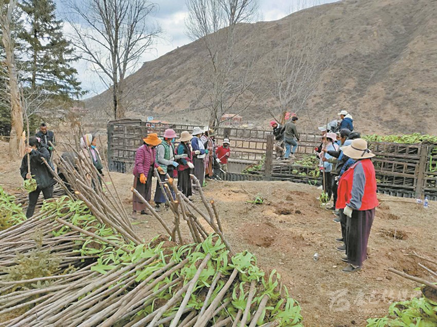 爐霍縣斯木俄米脫貧攻堅造林專合社組織村民下苗,準(zhǔn)備栽種。 爐霍縣林草局 供圖