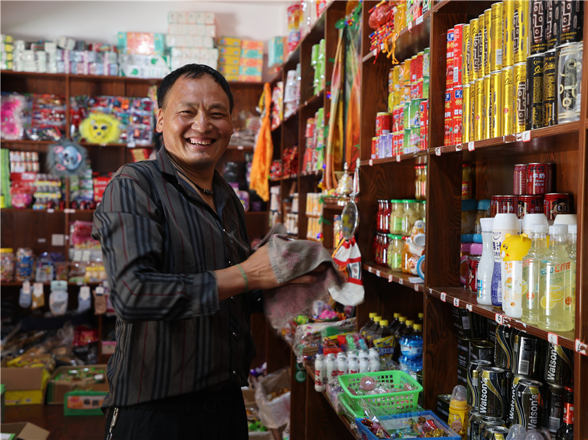 一大早,村民彭措就開始忙里忙外的收拾著小超市和茶樓,掃地、拖地、擦拭商品……每一個環(huán)節(jié)他都做得一絲不茍,他所打理的這個小超市和茶樓是村里的集體經(jīng)濟之一,每個季度都由村民們輪流負責(zé)日常經(jīng)營。這個不大的村子共有4個組67戶327人,每個季度從四個組中安排三戶村民負責(zé)村集體經(jīng)濟的運營。