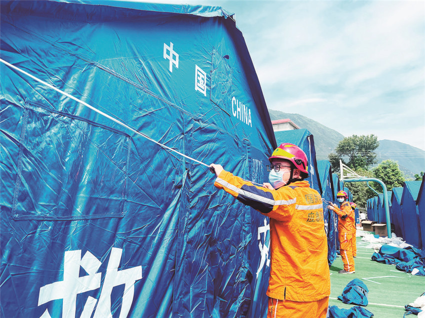9月8日,當(dāng)救援隊伍陸續(xù)離開磨崗嶺村的時候,一頂頂藍色的帳篷已經(jīng)搭建完畢,村民們已經(jīng)全數(shù)搬進救災(zāi)帳篷。記者獲悉,后續(xù)救援物資將通過被搶通的道路陸續(xù)運抵村子。