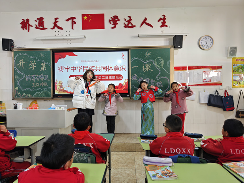 “同學們,新學期新起點,沐浴著紅城綠谷春的氣息,我們定要同努力、共奮進,健康成長,揚眉‘兔’氣!”典禮一結(jié)束,學生回到教室后,各班班主任便結(jié)合班級情況,開展以“鑄牢中華民族共同體意識”為主題的“開學第一課”班會活動。
