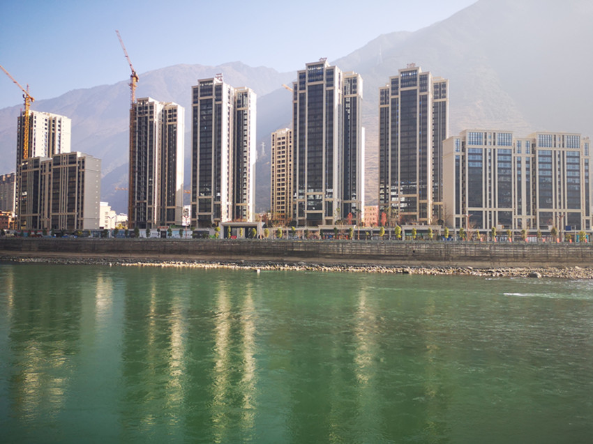 瀘定縣新城“艾威·春之陽(yáng)光城”工地,3幢大樓已封頂,“第四代現(xiàn)代住宅垂直森林生態(tài)宜居”的概念吸人眼球。