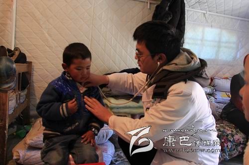 在新都橋鎮(zhèn)東俄洛三村的一頂救災(zāi)帳篷里,來自“雅安市抗震救災(zāi)醫(yī)療救援小組石棉分隊”的石棉縣人民醫(yī)院內(nèi)科醫(yī)生李登豐正在給當?shù)貎和恋嵌嗉獧z查身體。土登多吉的母親說孩子這兩天感冒了,經(jīng)過檢查,李登豐發(fā)現(xiàn)土登多吉并未發(fā)燒,只是扁桃體有點發(fā)炎,于是趕緊讓同行的護理人員拿來了治療感冒和消炎的藥物。