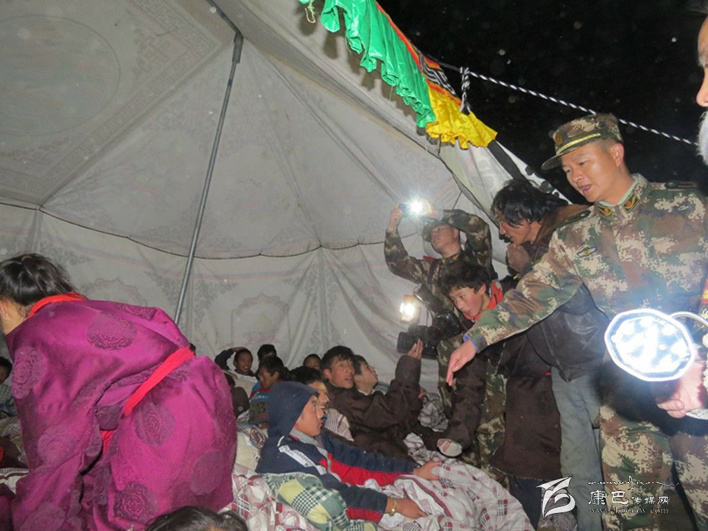 23日凌晨2時許,當(dāng)木雅祖慶學(xué)校安置點所有師生和群眾入住帳篷后,官兵們開始為85頂帳篷里的群眾逐一發(fā)放棉衣、棉被等救災(zāi)物資。“我不想住這里!我要回家,這里會垮掉……”15歲的八年級學(xué)生索讓還未從地震陰影中走出來,驚魂未定的他不聽老師和同學(xué)們的勸告,執(zhí)意要“逃離”安置點。高俊帶領(lǐng)軍醫(yī)及時趕來安撫索讓,“有武警叔叔在,不怕……”高俊摟著索讓的肩耐心地安撫著,當(dāng)他輕撫其額頭時發(fā)現(xiàn)索讓有些發(fā)燒,便立即安排軍醫(yī)為其服藥并物理退燒,直到其安然入睡才悄悄離去。