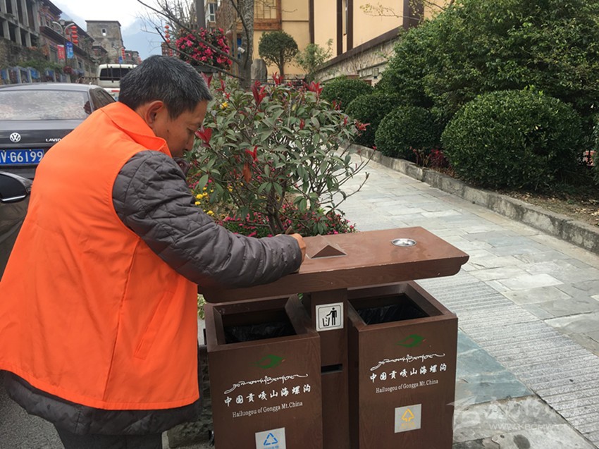 “走,我們到街上逛逛,看看海螺溝的變化?!痹诤B轀暇皡^(qū)管理局政治部主任龔自毅的陪同下記者來到磨西鎮(zhèn)街上。邊走邊看,記者看見龔自毅只要發(fā)現(xiàn)街上有煙頭或垃圾時(shí),就會(huì)彎腰把這些垃圾撿起來,扔進(jìn)垃圾桶。