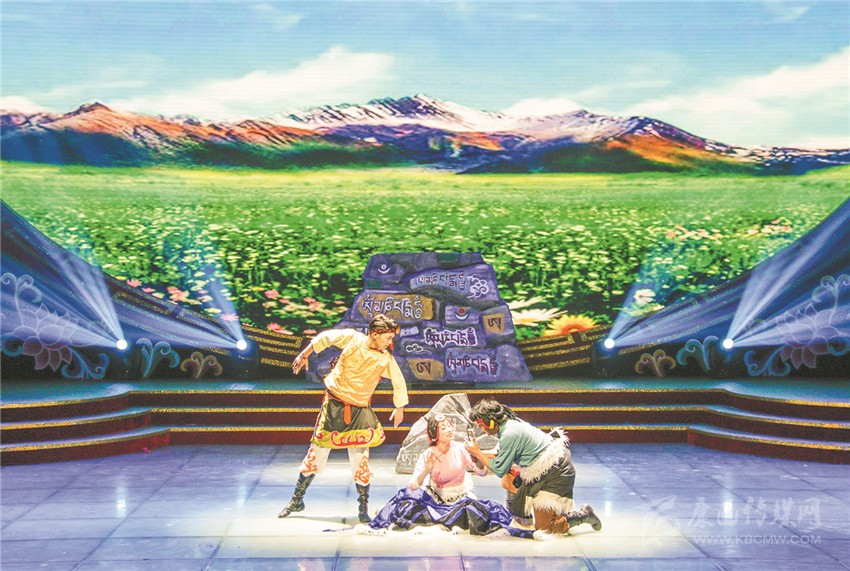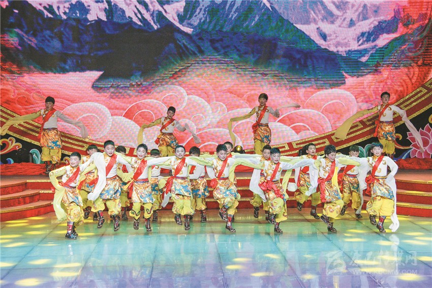 在團(tuán)拜會(huì)節(jié)目演出環(huán)節(jié),隨著主持人一句“柳綠枝頭待燕歸,金雞賀歲開門紅”脫口而出,20余名活潑、歡快的少年涌上舞臺(tái),就著音樂的節(jié)拍,揮手踏足、左挪右轉(zhuǎn),翩翩起舞;少年們舞動(dòng)的長袖映著縷縷斑斕的光束,依如雄鷹在拍打著飛翔的翅膀。這便是此次演出的開場節(jié)目《雛鷹飛翔》,一場絢麗多彩的“甘孜春晚”由此火熱開演。隨后,一群體態(tài)輕盈、妝如仙鶴的女子用靈動(dòng)的舞姿為甘孜祈福,點(diǎn)明了此次團(tuán)拜會(huì)的一大主旨——祝福甘孜。