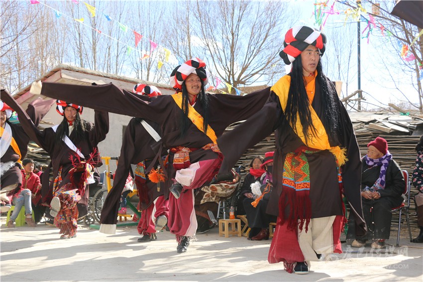 演出現(xiàn)場,80歲的澤則瑪高興地說:“我們一直都是從電視上觀看全國各地舉辦的新春文藝表演,沒想到今年春節(jié)我們小小的一個村子也有了自己的舞臺?!贝竽瓿跻?,村民們早早吃過飯,穿上表演服在村級文化活動室等待10點鐘正式演出,活動室外的觀眾們正翹首以盼。伴隨著歡快的歌舞聲響起演員們翩翩起舞,為村子增添了節(jié)日的歡樂。