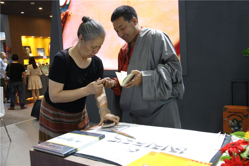 而在同一地點(diǎn)的另一側(cè),省級(jí)藏文書法傳承人巴松鄧珠的藏文書法也吸引著眾多愛好書法市民前來觀賞,還有的與他合影?!爸笇?dǎo)過我的書法家非常多,他們不僅給了我許多寶貴的意見,更重要的是給了我信心和動(dòng)力,讓我堅(jiān)持寫書法,并成為康體藏文書法的傳承人?!卑退舌囍檎f,這次能夠得到州委、州政府搭建的平臺(tái),我會(huì)珍惜好這次難得的機(jī)遇,把作品展示好、宣傳好,讓全國(guó)各地的人們更多地了解我州民族文化。
