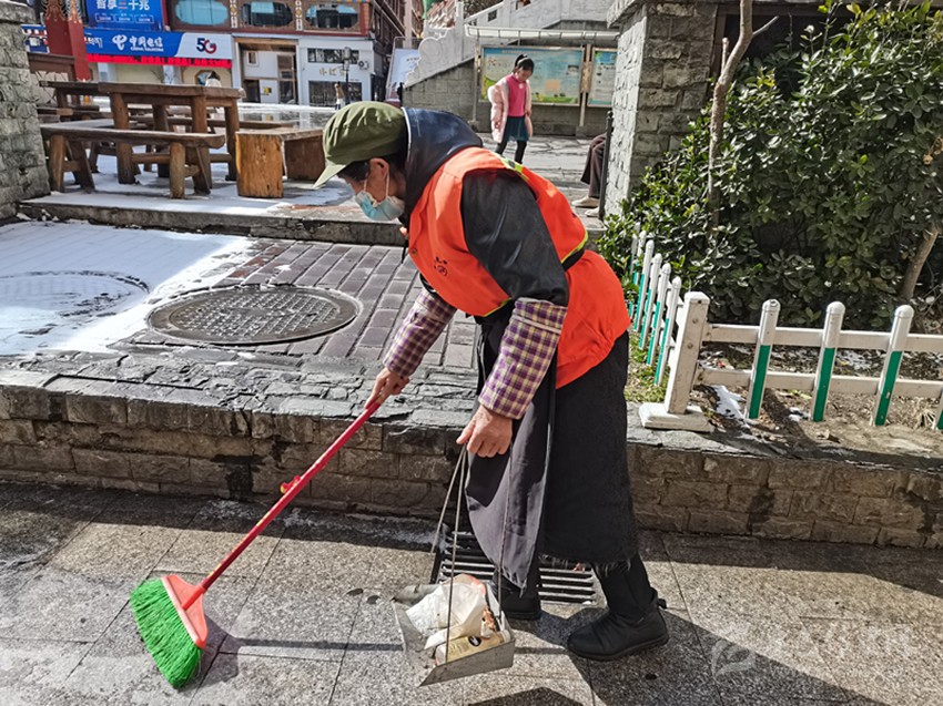 1月30日,農(nóng)歷大年廿九,在康定市的街道,環(huán)衛(wèi)工人宋光芳已穿好工作服,拿著掃帚和撮箕,仔細(xì)地清掃路面。自2012年,宋光芳從事環(huán)衛(wèi)工作,到現(xiàn)在已經(jīng)10個(gè)年頭了,在這10年里,她每天早出晚歸,耕耘在環(huán)衛(wèi)工作第一線。為了給市民營(yíng)造干凈、舒適的節(jié)日環(huán)境,今年春節(jié)她仍和往年一樣堅(jiān)守在工作崗位上,保證城市干凈衛(wèi)生的環(huán)境。
