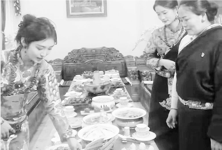 在藏裝制作點,主持人穿上縫紉藝人們親手制作的服裝,無論布料、絲線的選用,還是精致繁復(fù)的技藝,都充滿了濃厚的鄉(xiāng)土氣息和民族特色。每一針每一線,都蘊(yùn)含著藝人們的心血與智慧。她們憑借著精湛的手藝,將絢麗多彩的布料剪裁、縫合,賦予其靈動的生命力。石渠服飾十分重視色塊與整體的相襯與和諧,以紅、黃、藍(lán)、綠、白、黑為主,呈現(xiàn)了石渠人民尊重自然的生態(tài)美。