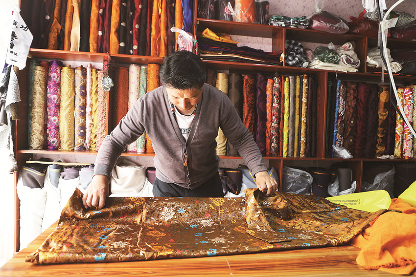 “傳統(tǒng)藏裝需要手工制作,青年、中年、老年人的款式各不一樣,料子也很有講究,還有裝飾也很重要……”說起登龍服飾,扎西澤仁神采飛揚,不時發(fā)出爽朗的笑聲,他說,“一般簡單的服裝制作僅需半天,復(fù)雜一些的要兩三天,價格從幾百元到幾千元不等。現(xiàn)在縣城的商店生意很好,每天都能接到很多訂單,在登龍鄉(xiāng)的鋪子交給徒弟打理也完全沒有問題?!?/span>