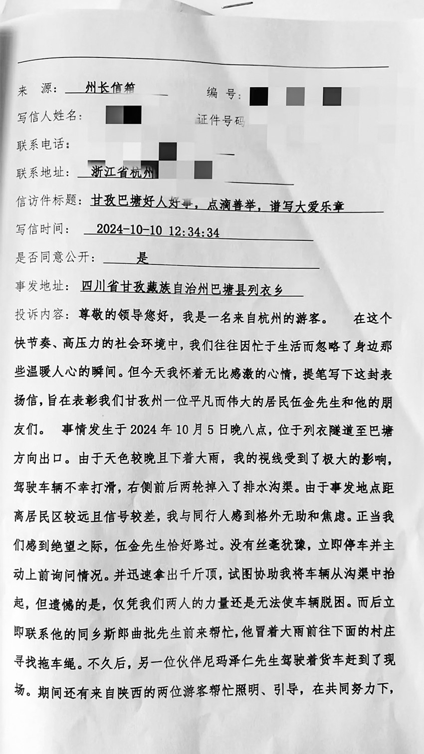 一封感謝信,從杭州的網(wǎng)端出發(fā),抵達(dá)“州長(zhǎng)信箱”,再轉(zhuǎn)送到巴塘,跨越千里,情意綿長(zhǎng),引出一段感人至深的好人好事?!白鹁吹念I(lǐng)導(dǎo)您好,我是一名來(lái)自杭州的游客。今天我懷著無(wú)比感激的心情,提筆寫下這封表?yè)P(yáng)信,旨在表彰我們甘孜州一位平凡而偉大的居民伍金先生和他的朋友們……”
