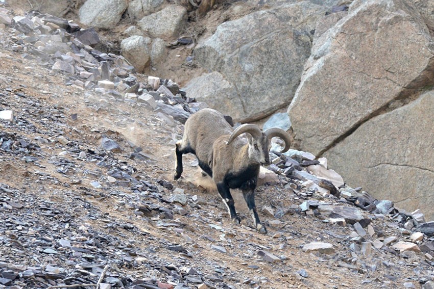 在回程的時(shí)候又看到一群巖羊,大約有20余只。這次與它們接近的距離僅有5、6米的地方。它們在隊(duì)員們的面前若無其事地吃草,只有一只母羊抬頭看了隊(duì)員們一會(huì)兒。和這只母羊如此近距離接近,以至于能看清它的眼神里似乎只有一些疑惑,卻沒有恐懼。