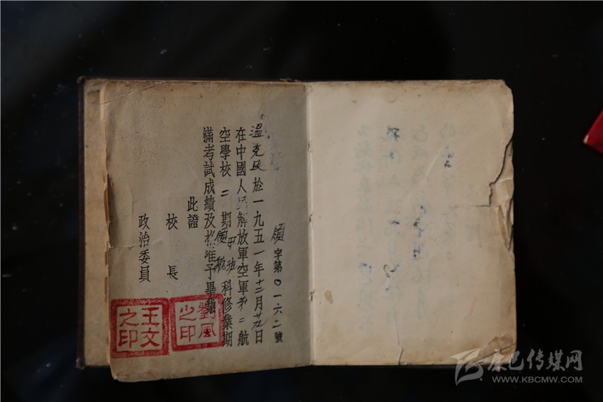 溫克棟的大兒子、57歲的溫樹平拿出大伯留下的遺物——一本中國(guó)人民解放軍航空學(xué)校畢業(yè)證書、一本中國(guó)人民解放軍空軍后勤部發(fā)的飛行裝具證、一本《中國(guó)共產(chǎn)黨黨章》、一本《中國(guó)人民政治協(xié)商會(huì)議共同綱領(lǐng)》,四本珍貴的文物書頁(yè)發(fā)黃,有的還有些微殘缺,但卻是珍貴的歷史見證物,溫家視為傳家寶。