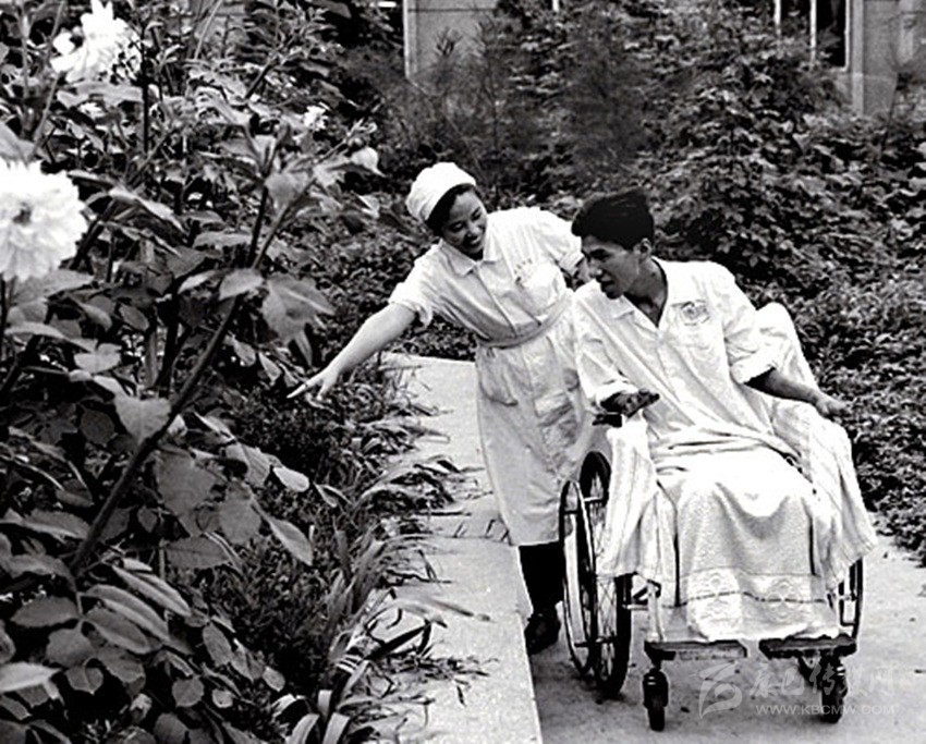 松田宏也在四川醫(yī)學院附屬醫(yī)院護士長陳克芳的護理下來到花園里。 資料圖片