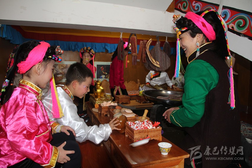 筆者正在參觀時,老師帶領(lǐng)著一群可愛的孩童走進(jìn)鍋莊房內(nèi)。孩子們脫下鞋襪,盤膝坐在藏床上,一邊做著喝酥油茶的樣子,一邊唱起古老的嘉絨歌謠。稚嫩的嗓音中,遠(yuǎn)古文化煥發(fā)出新時期的獨(dú)特魅力。老師則坐在火籠邊,不斷地“忙碌”著。孩子們“吃飽喝足”后,走到房屋主人的扮演者老師面前鞠躬致謝,文明禮儀也得到了升華。