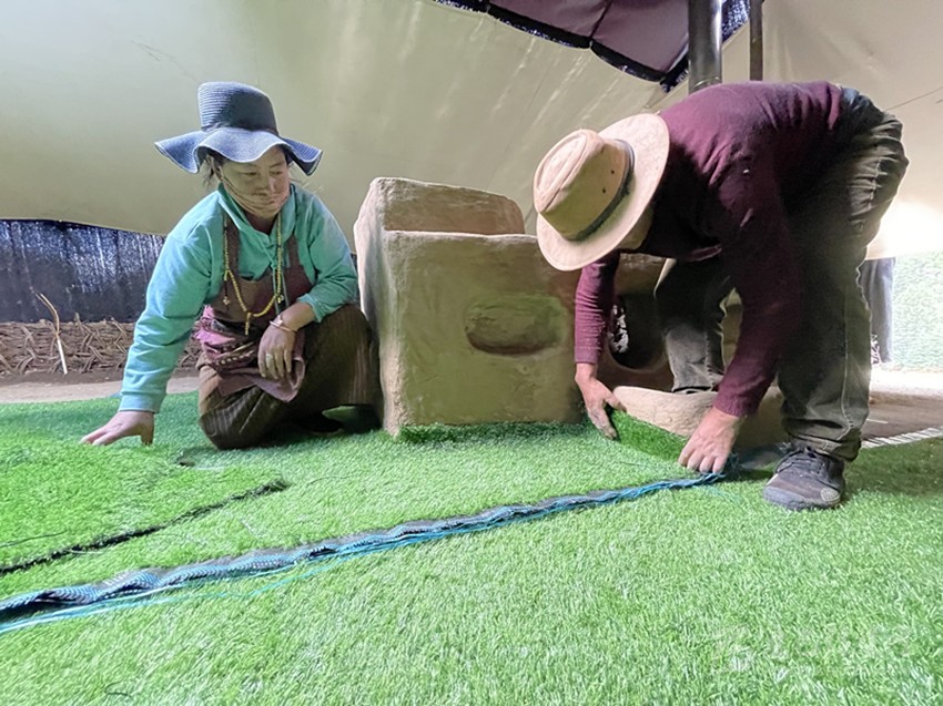 村民正在裝飾旅游帳篷。
