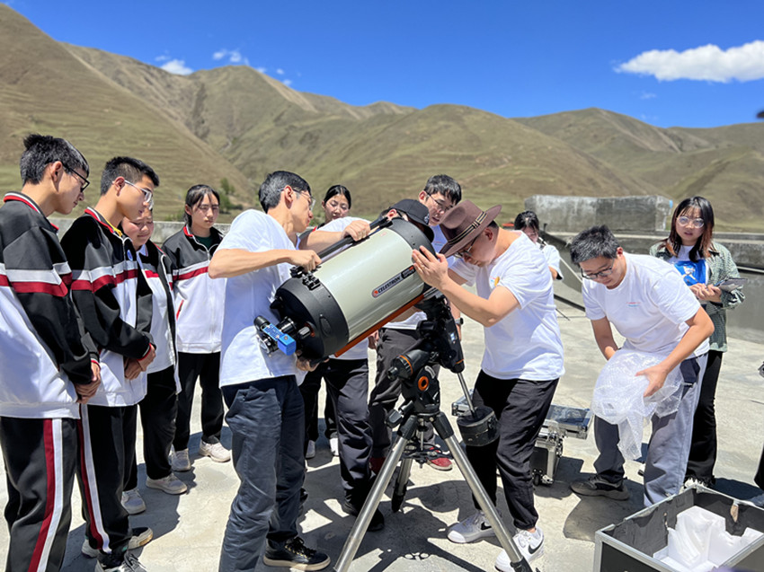 “向天空出發(fā)”公益幸福團(tuán)成員和瀘定中學(xué)師生們展示捕捉到的“天宮”空間站影像。