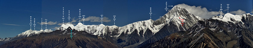 王志偉坦言:“拍攝不難,但核準校對費時費力。因為空間角度關(guān)系,每一座山峰的確定都需要花費大量時間奔走于不同的觀景點進行拍照,并反復(fù)比對衛(wèi)星地圖,最后從山形、與主峰的距離等方面準確定位山峰的位置?!北热缭跇俗⑷諡跚曳鍟r,他將另一座山峰誤標,在最后一次比對時才發(fā)現(xiàn),又重新調(diào)整定位;而另外一座叫年波貢嘎的山峰,由于角度原因全景拍攝不到而作了單獨標注,所以并未呈現(xiàn)于全景標注圖中。