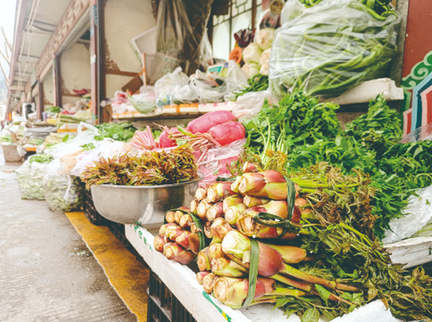 圖為蔬菜攤位擺放的各種野菜。