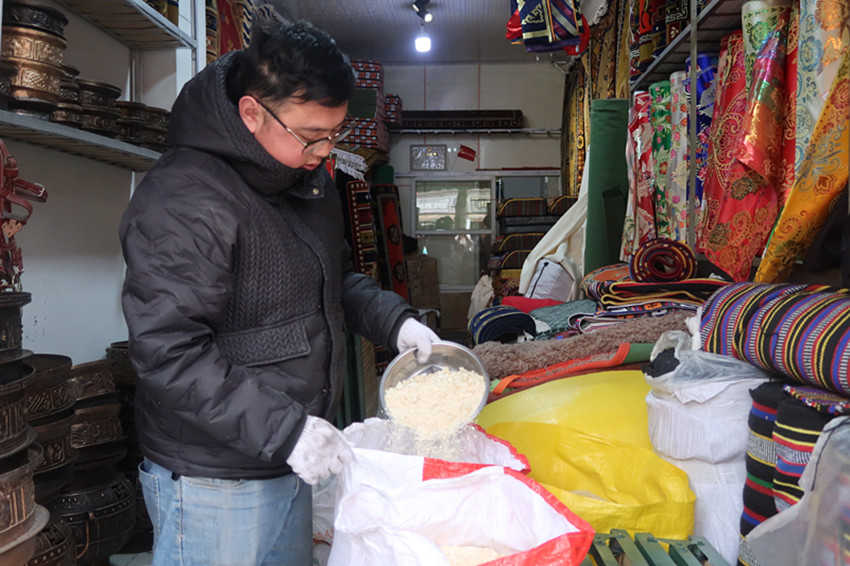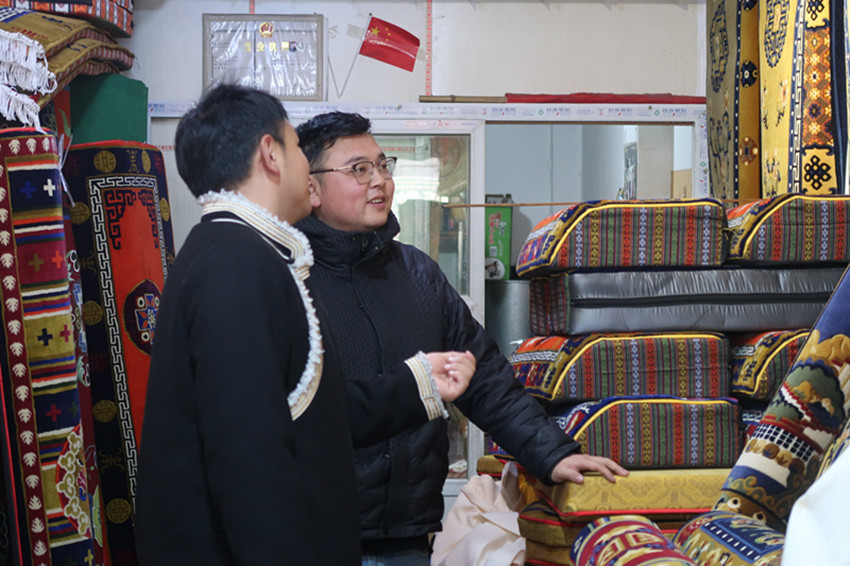 這個30多平方米的商鋪內人頭攢動,地毯、布料、銅鍋……各種物品應有盡有?!疤鹤佑昧舜蟀肽炅?,質量還是這么好,不僅沒變形,顏色還是那么鮮艷,所以今天專門來再買一個拿回家備用。”客人尼瑪說。