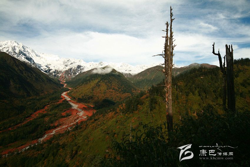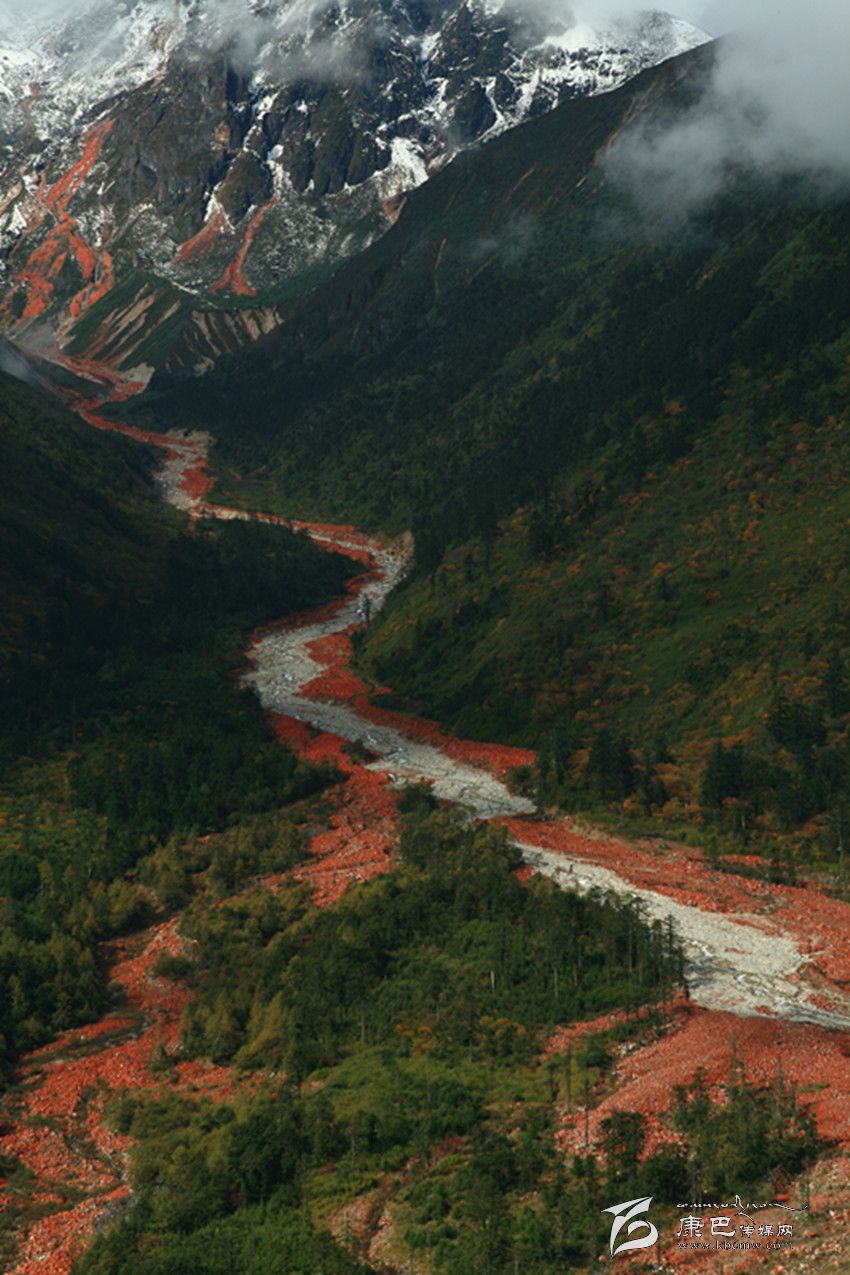 總起來(lái)說(shuō),紅石灘是這樣一壁畫(huà)屏:兩黛山之間,為一大溝;大溝飛流直下,紅石如瀑增多,至平地,紅石成片,如水瀉地;在兩黛山及大溝的背后,為一壁雪山,冰清玉潔,十分醒目。