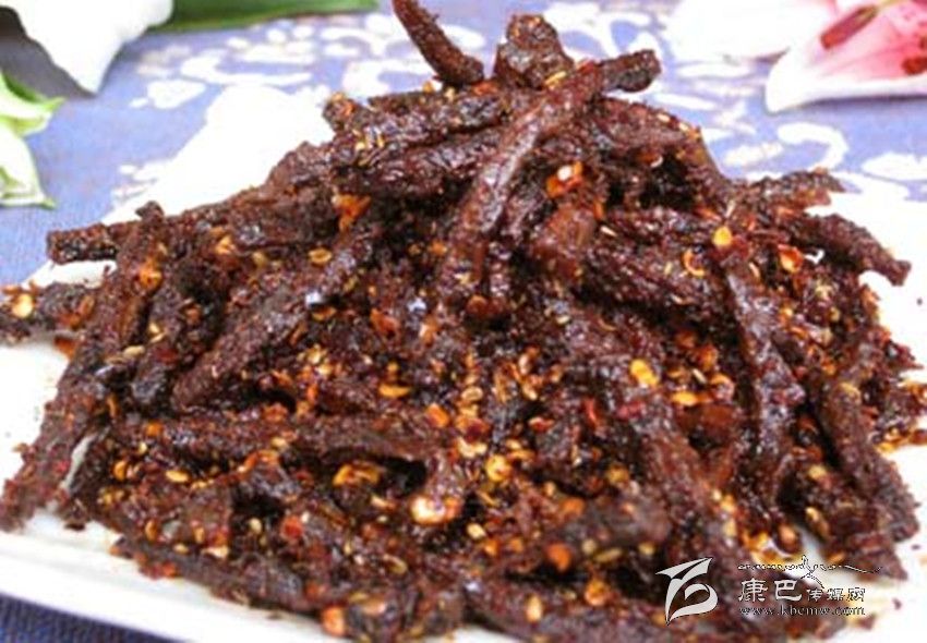 牛肉干以果洛藏族自治州生產(chǎn)的“雪山牌”最為著名。它是以新鮮牦牛肉為原料,取凈肉加白水煮熟后,切成小塊,然后加入花椒粉、咖喱粉、味精、料酒、糖、鹽等佐料干炒、烘干而成。香氣濃郁,滋味鮮美。