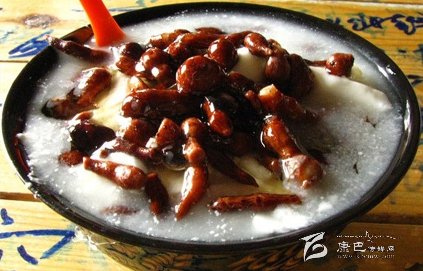 人參果飯也叫“卓瑪折絲”。將人參果煮熟后,放在米飯上面,細(xì)細(xì)地撒些白糖,再均勻地淋上一勺滾燙的酥油汁,一份營養(yǎng)又好吃的人參果飯就做好了。人參果飯被藏族同胞視為一種吉祥的食物,只在婚禮、節(jié)日食之,以之待客,視為尊貴之意。在隆重的藏歷新年,人參果飯會被盛在一個小巧精致的盛器內(nèi),供于佛龕前。