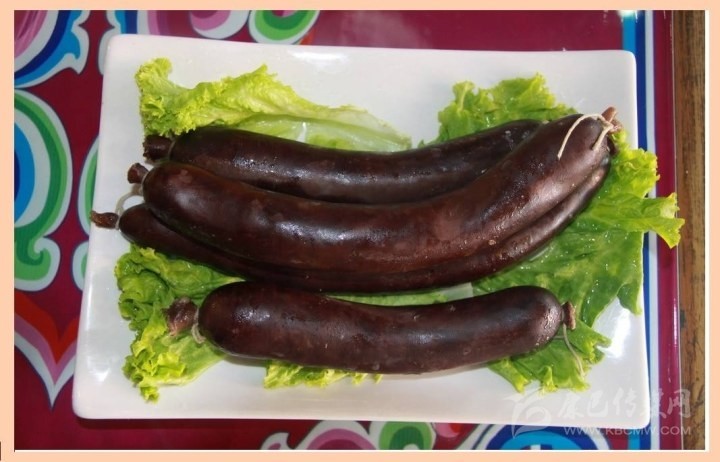 血腸:是將宰殺牲畜的血與玉米面或麥面、蕎面混合在一起,再加以食鹽、花椒面等香料提味,然后將混合物裝進(jìn)洗干凈的牲畜腸里,人鍋煮熟即可。吃的時候,或蒸或烤:蒸則腸衣柔軟很有嚼頭;烤則腸衣香脆可口。因為血腸不能長時間保存,所以吃血腸的時間一般在宰殺牲畜的幾天內(nèi)。