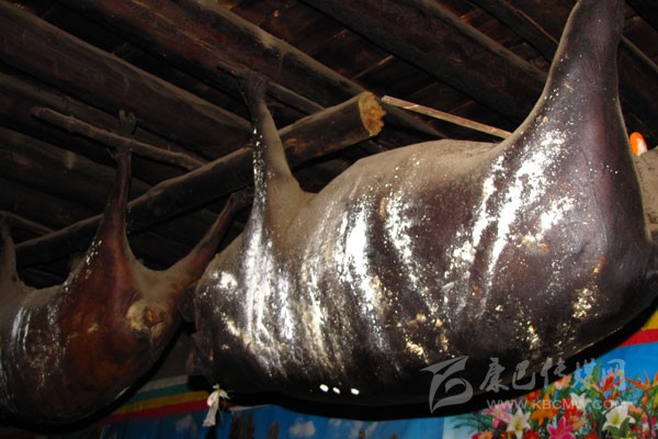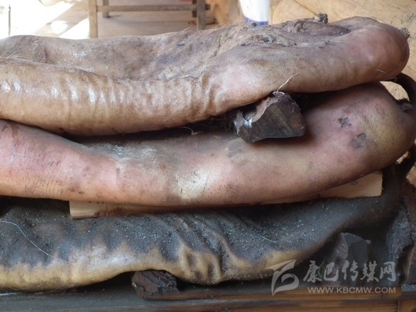 豬膘:在丹巴,豬膘是一種貯存豬肉的方式,是一種飲食習(xí)俗,同時,它又是財富的象征。在丹巴隨便走進(jìn)一戶人家都可以看到少則幾扇、多則十余扇的豬膘掛在樓上,有些人家的豬膘甚至還貯存十多年之久。這些豬膘大多已經(jīng)被蟲吃掉了許多,但是他們也不會心痛,因為在過去,看一個丹巴人家庭是否富裕,就看他家有多少豬膘,豬膘越多就越富有。