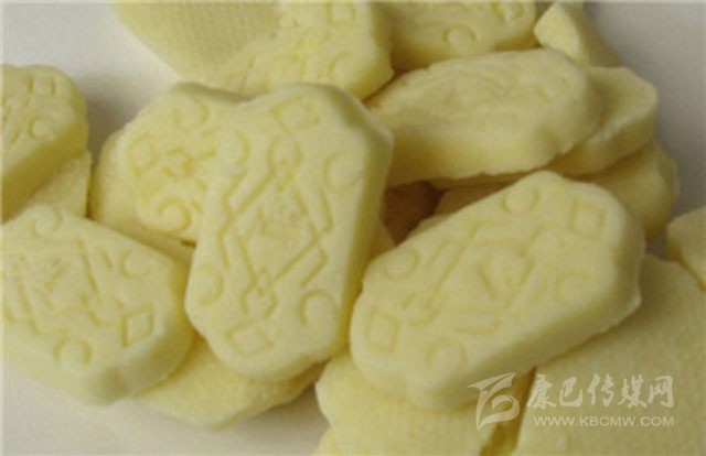 奶渣點(diǎn)心,藏語稱“特”。奶渣的做法很簡單,通常選用做酥油剩下的奶渣篩出細(xì)奶渣,或用小石磨磨成粉,加入白糖拌勻,盛在盆內(nèi),澆入融化的酥油,冷卻凝固成形后即可取出食用。