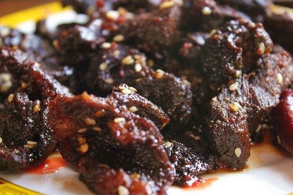 3500米以上地區(qū)這些地方生長著許多野生藥種如貝母,蟲草等,耗牛常食這些藥材,其肉鮮美無比,殺后可炒紅燒,清燉或涼曬成干巴等,其味獨特,吃耗牛肉在迪慶,實在是一種享受。并可在市場購買干巴,肉松等作饋贈青朋好友的禮品。牦牛肉可以粘辣椒油,味道仍然鮮美??刀ǖ呐H獠粌H有牦牛肉,還有熏牛肉等等,比起其他康定特產(chǎn)更是別具一番風(fēng)味。